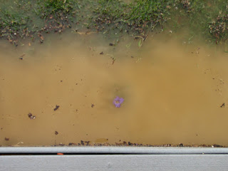 While we were at church I could hear that there was a massive thunderstorm rolling through! I had no idea. There was standing water in the parking lot that stretched from one side to the other. Water splashed over cars as they pulled out of the parking lot. We had to find an alternative route home because water would have reached almost the top of our tires if we tried to turn at the corner we normally do. Our garden is now the pond I always dreamed of. Except it looks dirty and ugly. In the picture above you may notice that you can see a flower. That flower is under water. The flowers used to be in my house, but I was chastised on how I didn't water them and they were dying. I planted them maybe a week and a half ago and they have been getting plenty of water since.